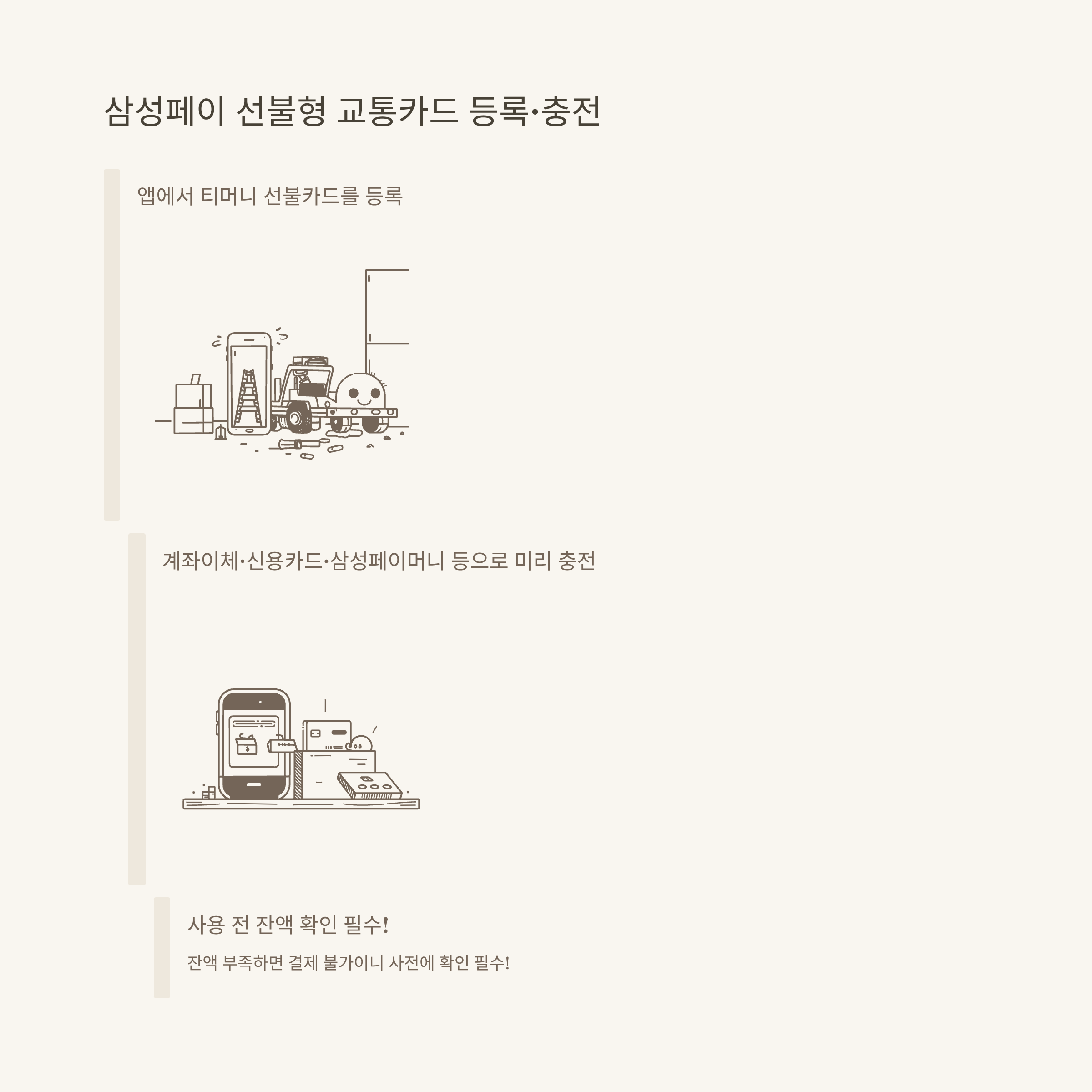 - 충전형(선불) 티머니는 삼성페이·티머니 앱에서 바로 충전 가능