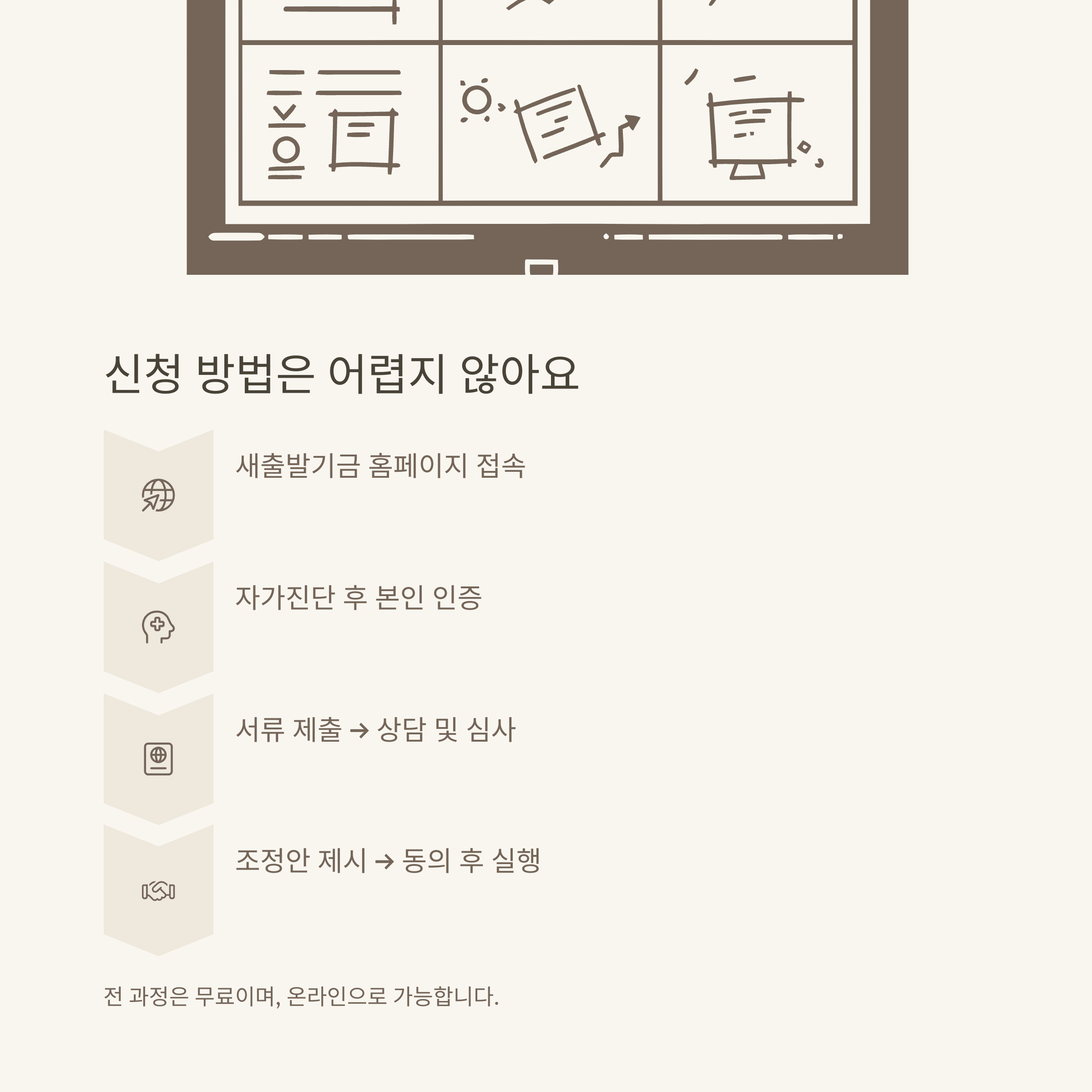 공식 절차 및 제출서류는 새출발기금 신청안내에서 단계별로 확인할 수 있습니다.