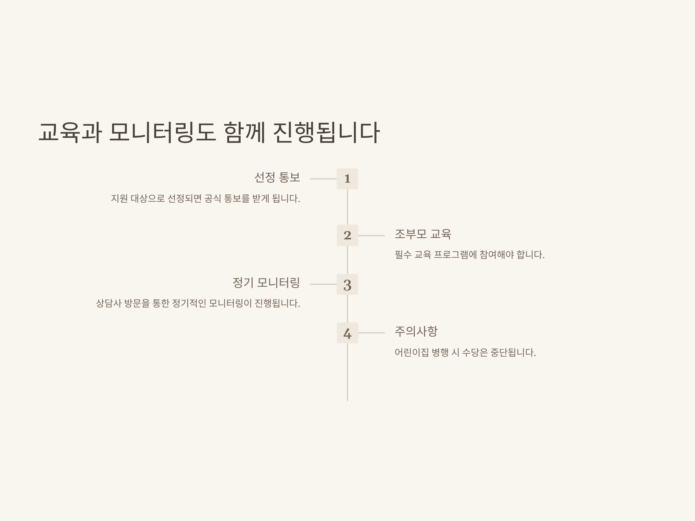 - 모니터링 방문, 교육 등은 시간 조율이 필요하니 가족 내 일정 상의 필수
