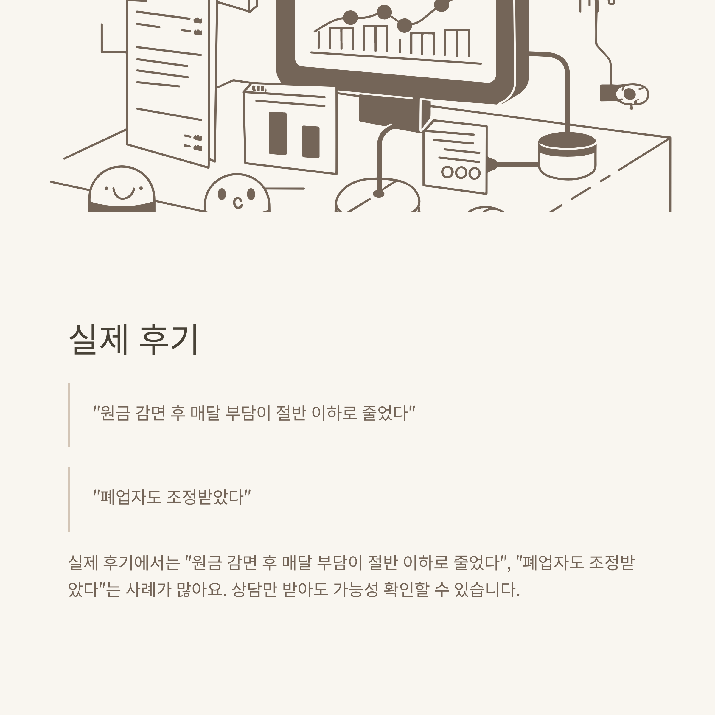 저는 직접 상담을 받고, 주변 소상공인 지인들도 신청한 사례를 많이 봤습니다. 한 분은 6개월 이상 연체가 누적된 상태였는데, 새출발기금 신청 후 연체이자가 전액 감면되고, 원금도 40% 이상 조정받아 매달 상환 부담이 크게 줄었다고 하더라고요.