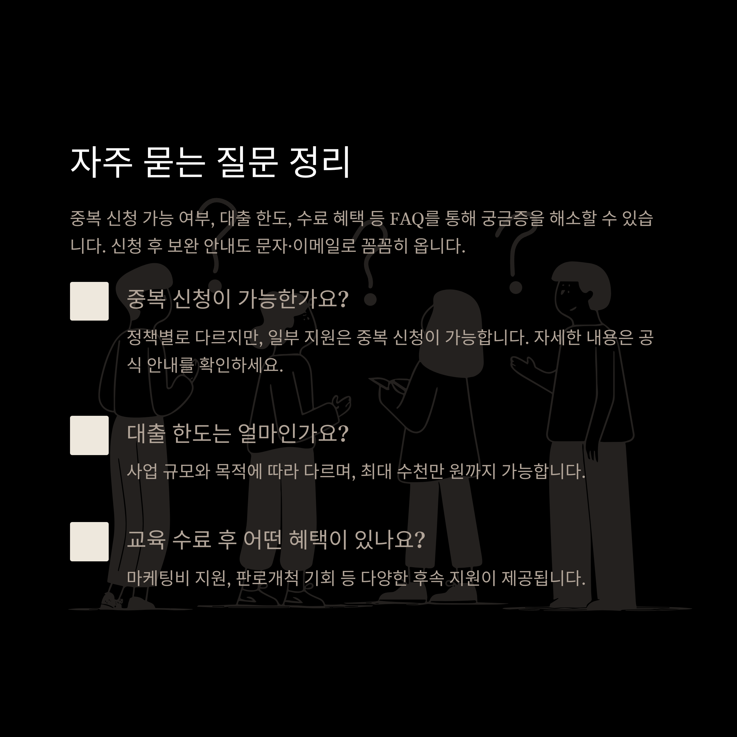 특히 이 세 가지는 사업의 ‘자금’, ‘전략’, ‘성장’까지 전 단계를 모두 지원해주기 때문에 매출이 막힌다 싶을 때, 혼자 고민하기보다 한 번쯤 꼭 경험해볼 만한 정책이었습니다.