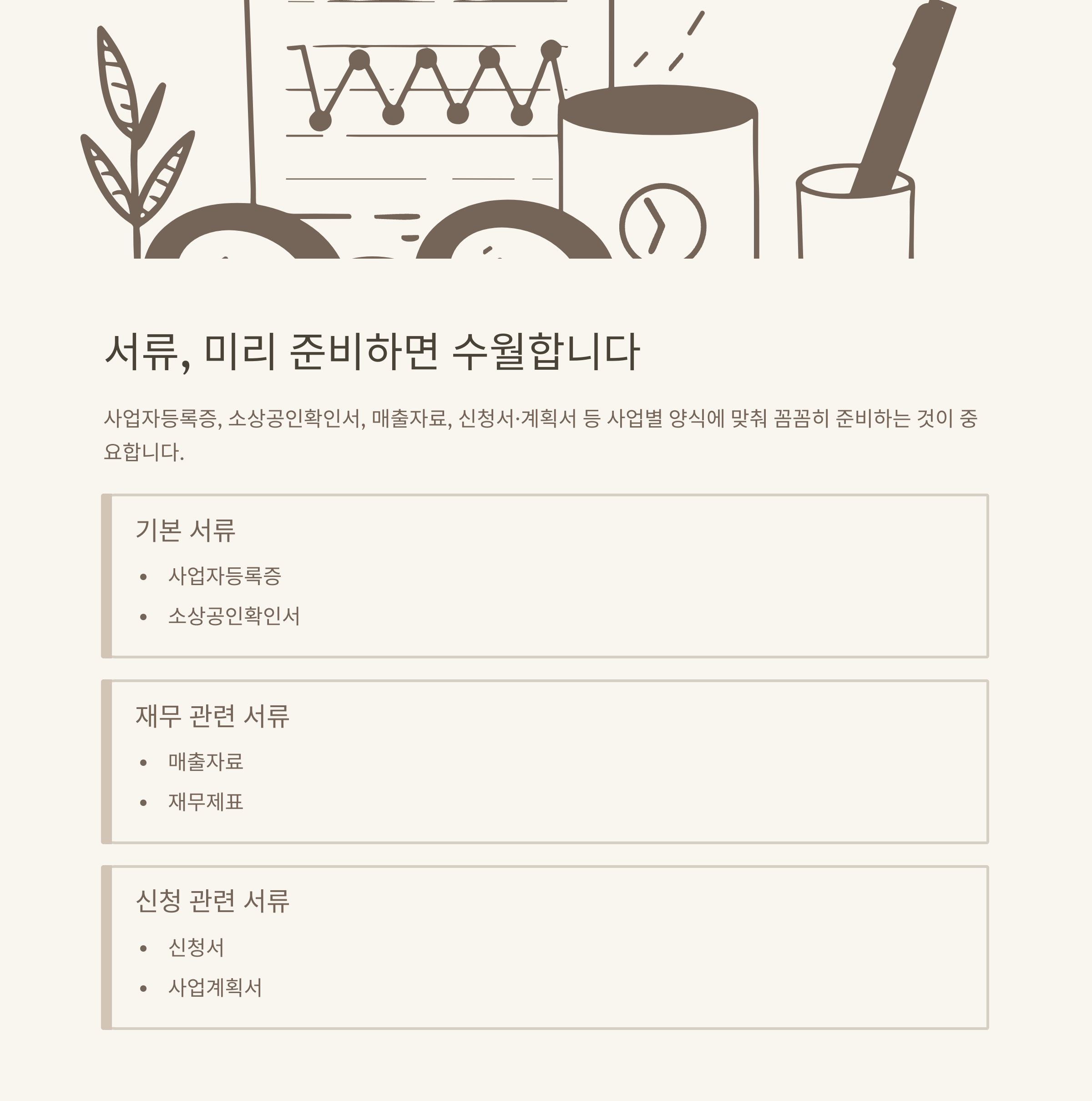 제가 처음 3대 지원사업에 도전할 때 제일 먼저 한 일은 ‘내가 대상에 맞는지’ 확인하는 거였습니다. 대부분 사업자등록증이 있고, 소상공인 기준(연매출·종사자 수 등)에 해당한다면 신청 가능했습니다.