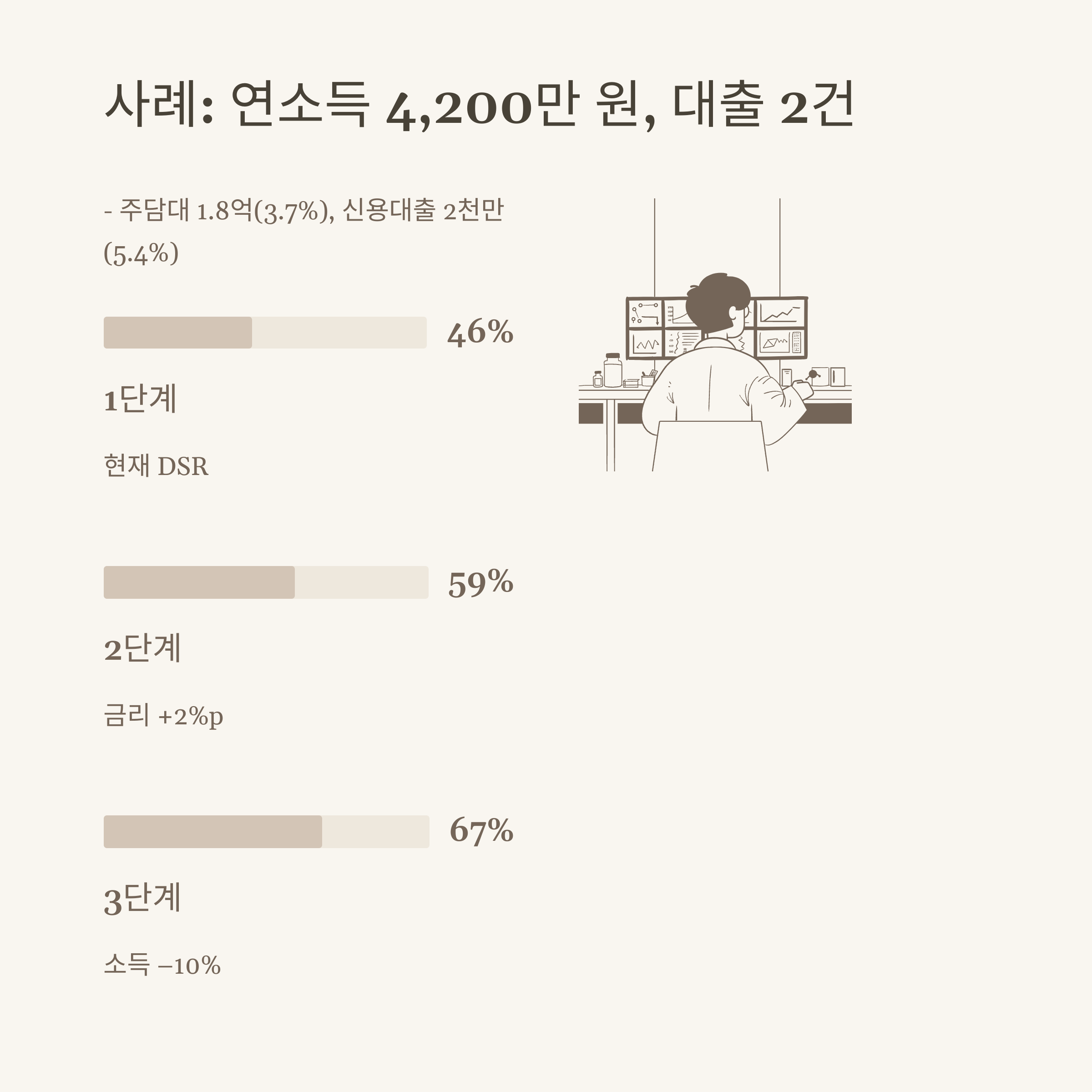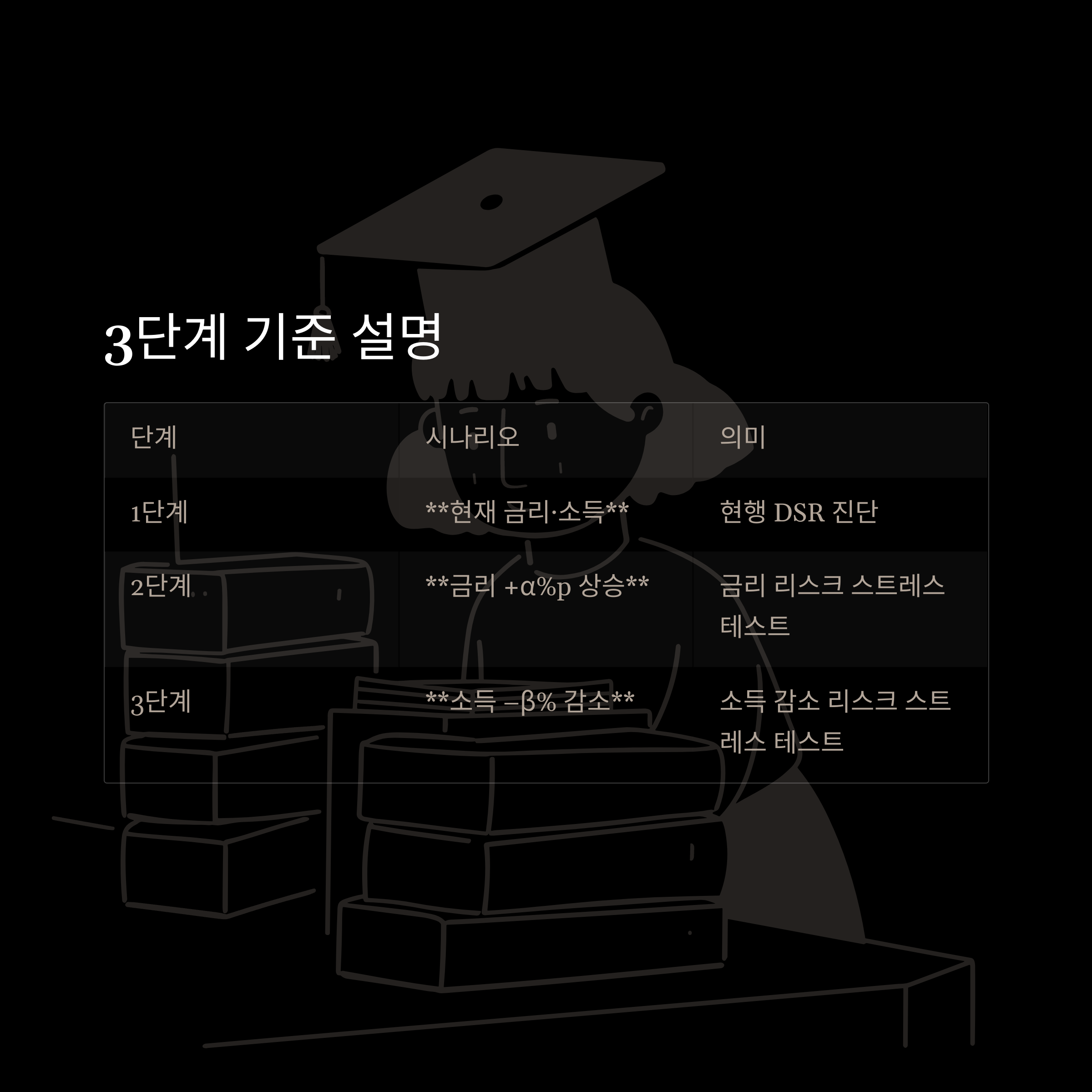 | 3단계 계산 방식 이해 | 현재, 금리 상승, 소득 감소 시나리오별 DSR 산출 |