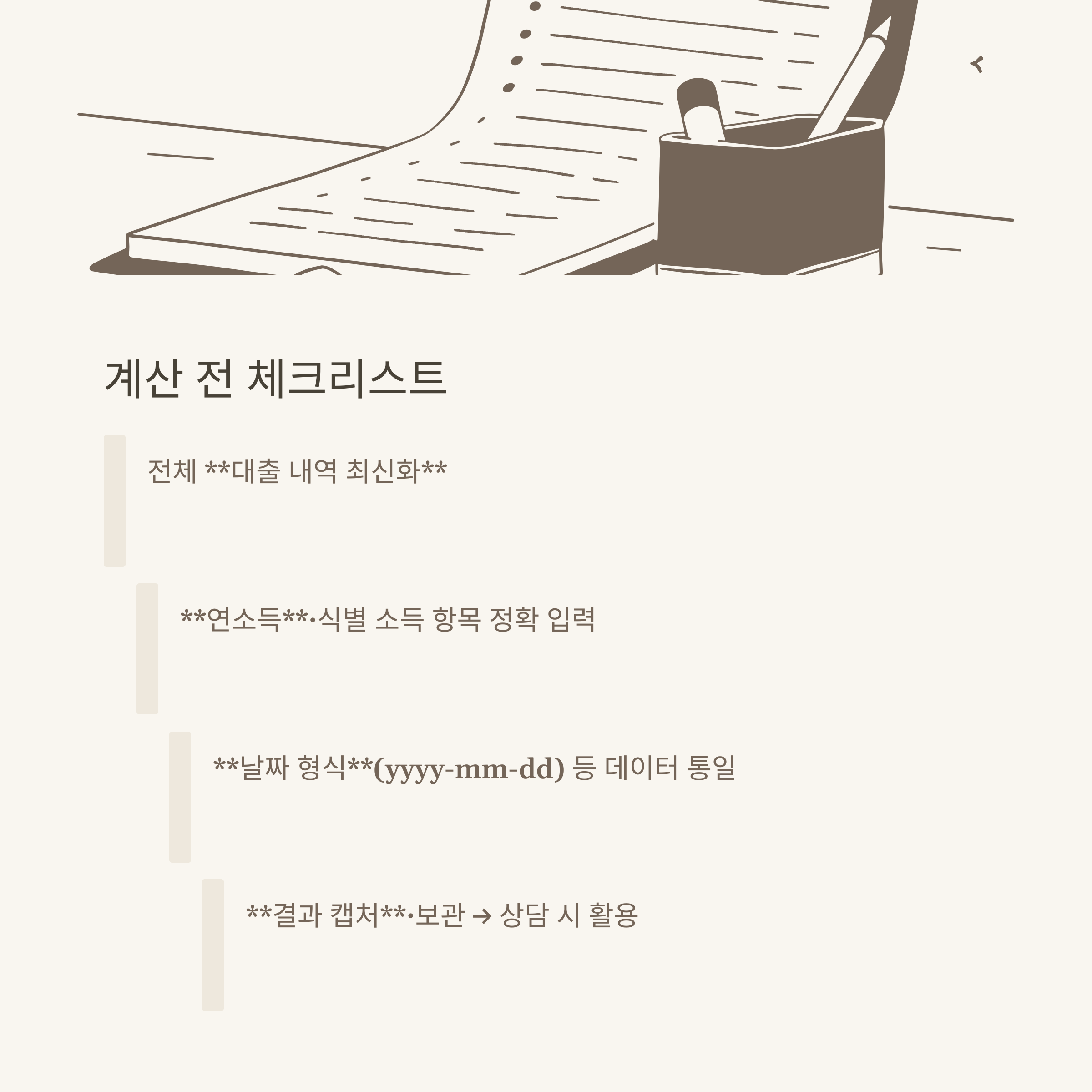 특히 계산 후 결과를 캡처해서 은행 상담 때 함께 보여주면, 상담사도 정확히 상황을 이해하고 더 나은 조건으로 제안을 주는 경우가 많습니다. 저는 이 체크리스트 덕분에 실제 대출 승인 시 한도도 더 받았고, 이자도 낮췄어요. 귀찮더라도 한 번쯤은 꼭 확인해보세요!