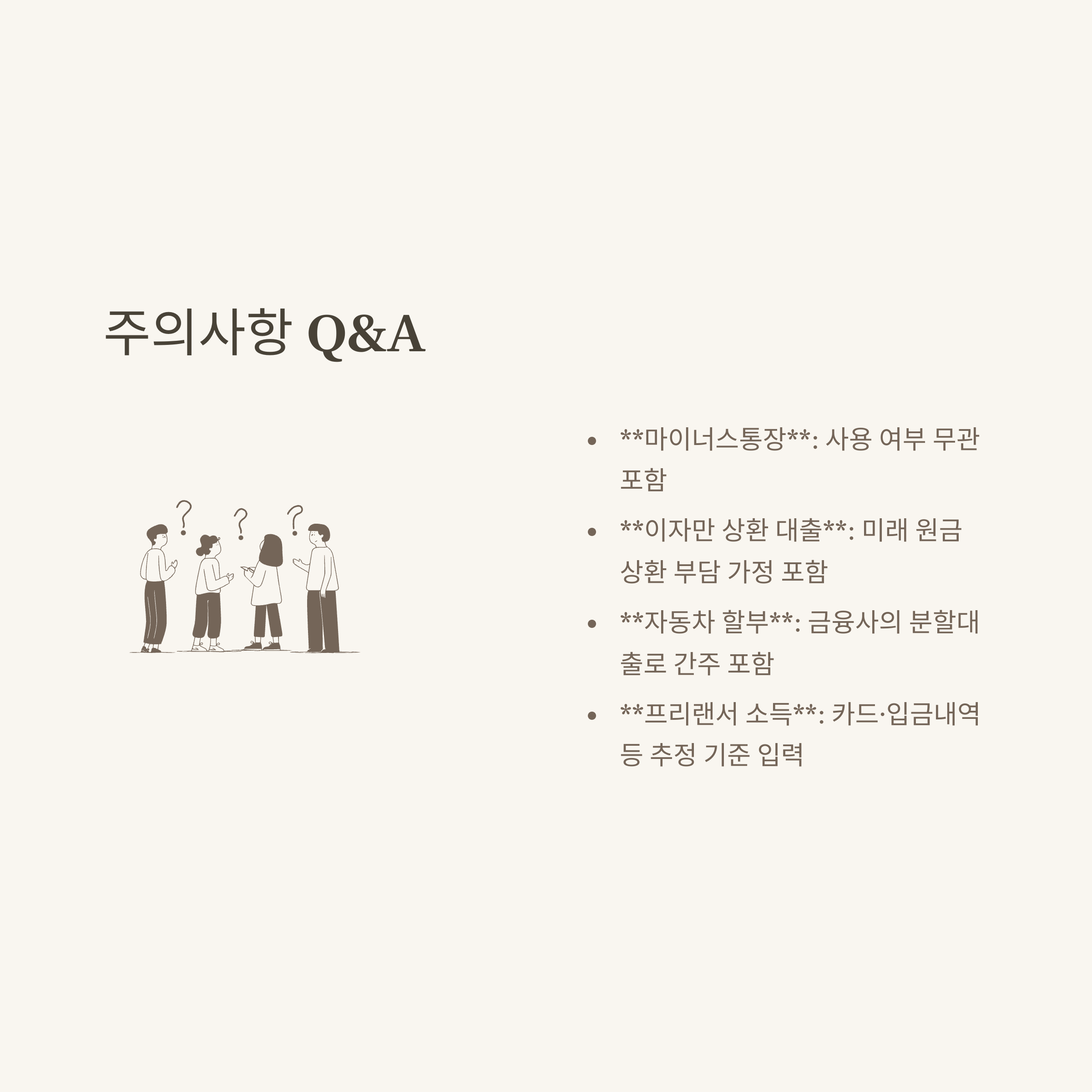 | 마이너스 통장은 쓰지 않아도 포함해야 하나요? | 네. 은행 심사 기준에서는 한도 전액을 대출로 간주합니다. |