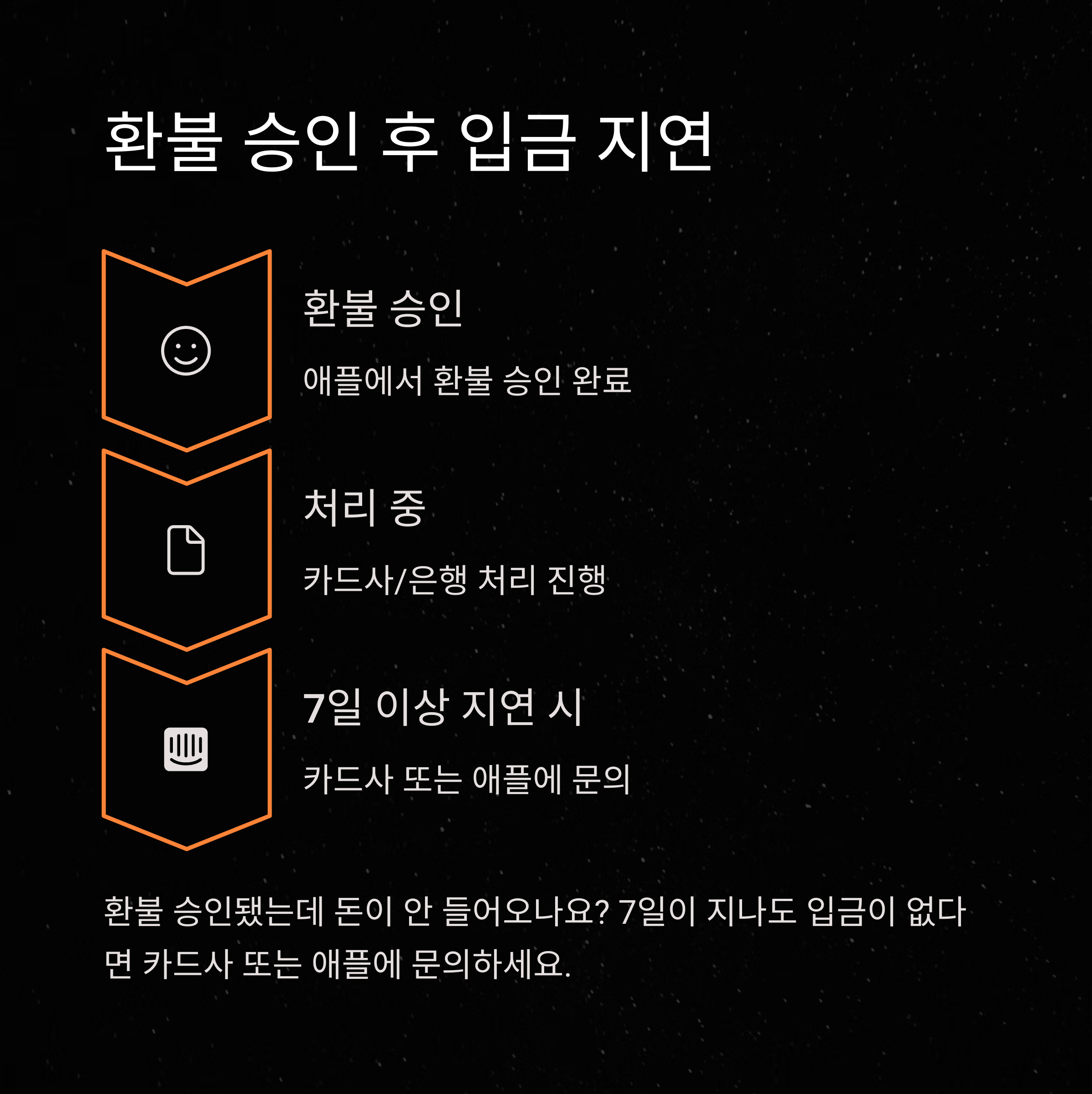 이 기간이 지나도 입금되지 않았다면, 애플 고객센터에 문의해 ‘환불 승인 번호’를 받고 카드사에 입금 여부를 직접 확인하는 것이 빠른 해결 방법입니다.