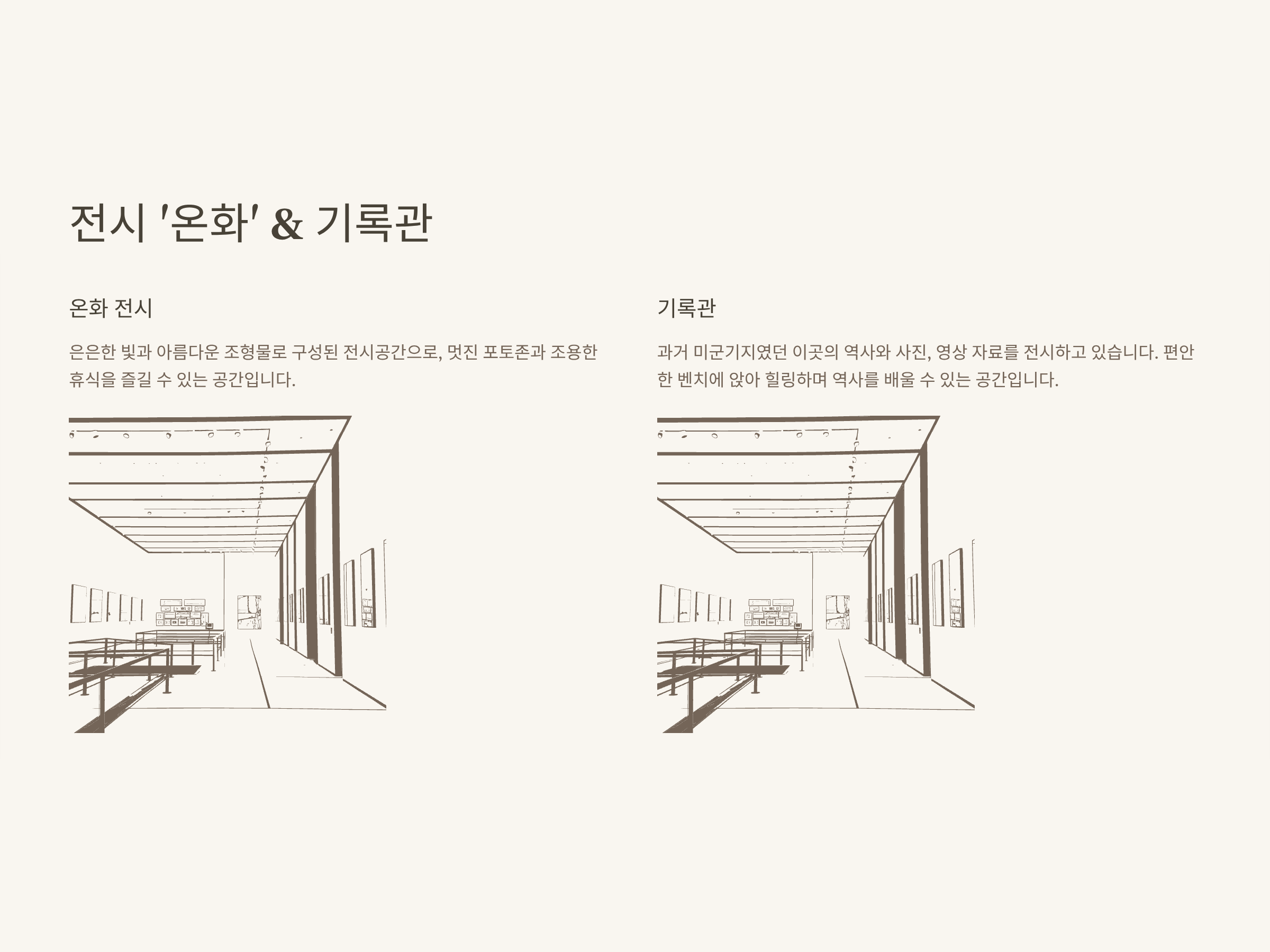 용산 어린이정원은 단순히 산책이나 물놀이만 즐기는 곳이 아니에요. 저는 꼭 추천하고 싶은 전시 공간이 ‘온화’와 ‘기록관’입니다. ‘온화’는 내부가 어둡고 은은한 빛으로 가득해서, 마치 미술관에 온 듯한 분위기를 느낄 수 있었습니다. 직접 눈으로 보는 게 훨씬 아름다워서, 다시 가고 싶을 정도로 기억에 남았어요. 기록관(수하우스 & 용산기지 스토리)은 실제 장교숙소를 개조한 곳으로, 용산 미군기지와 주변 역사의 흔적을 그대로 느낄 수 있습니다. 저는 벤치에 앉아 쉬면서, 사진과 영상으로 과거의 이야기를 찬찬히 둘러봤습니다.