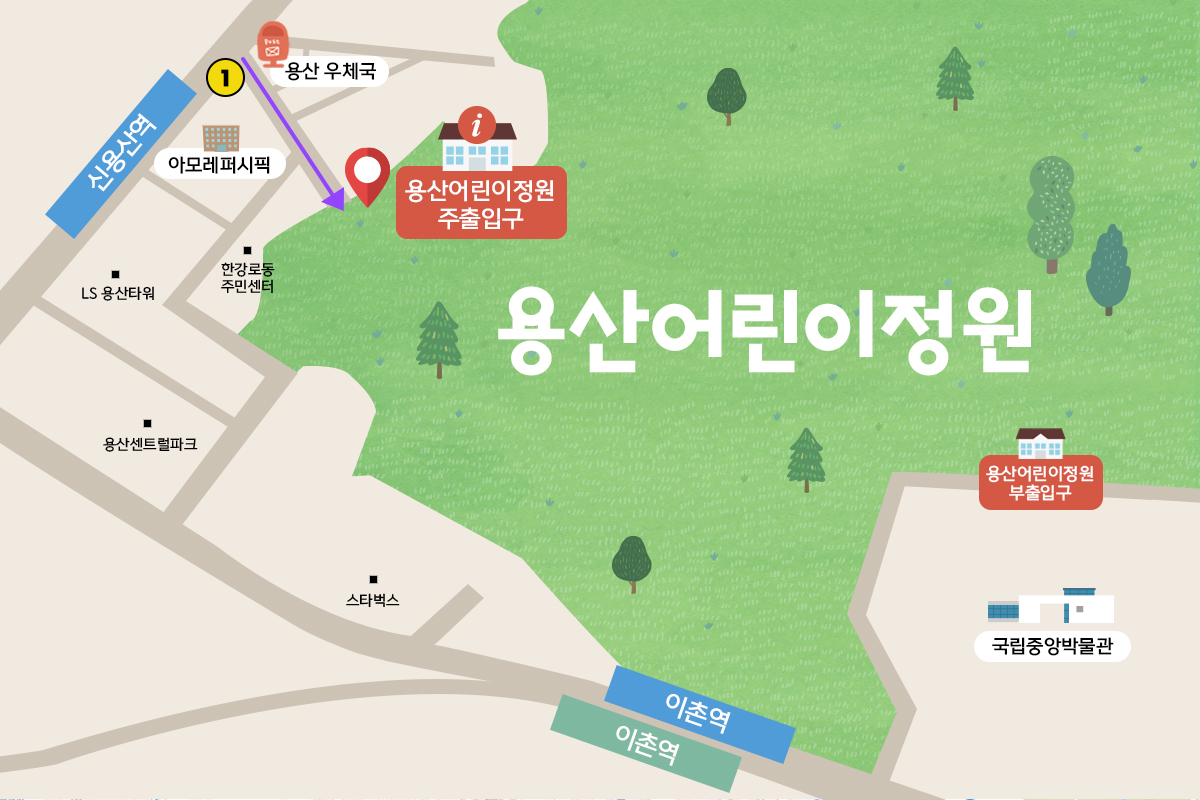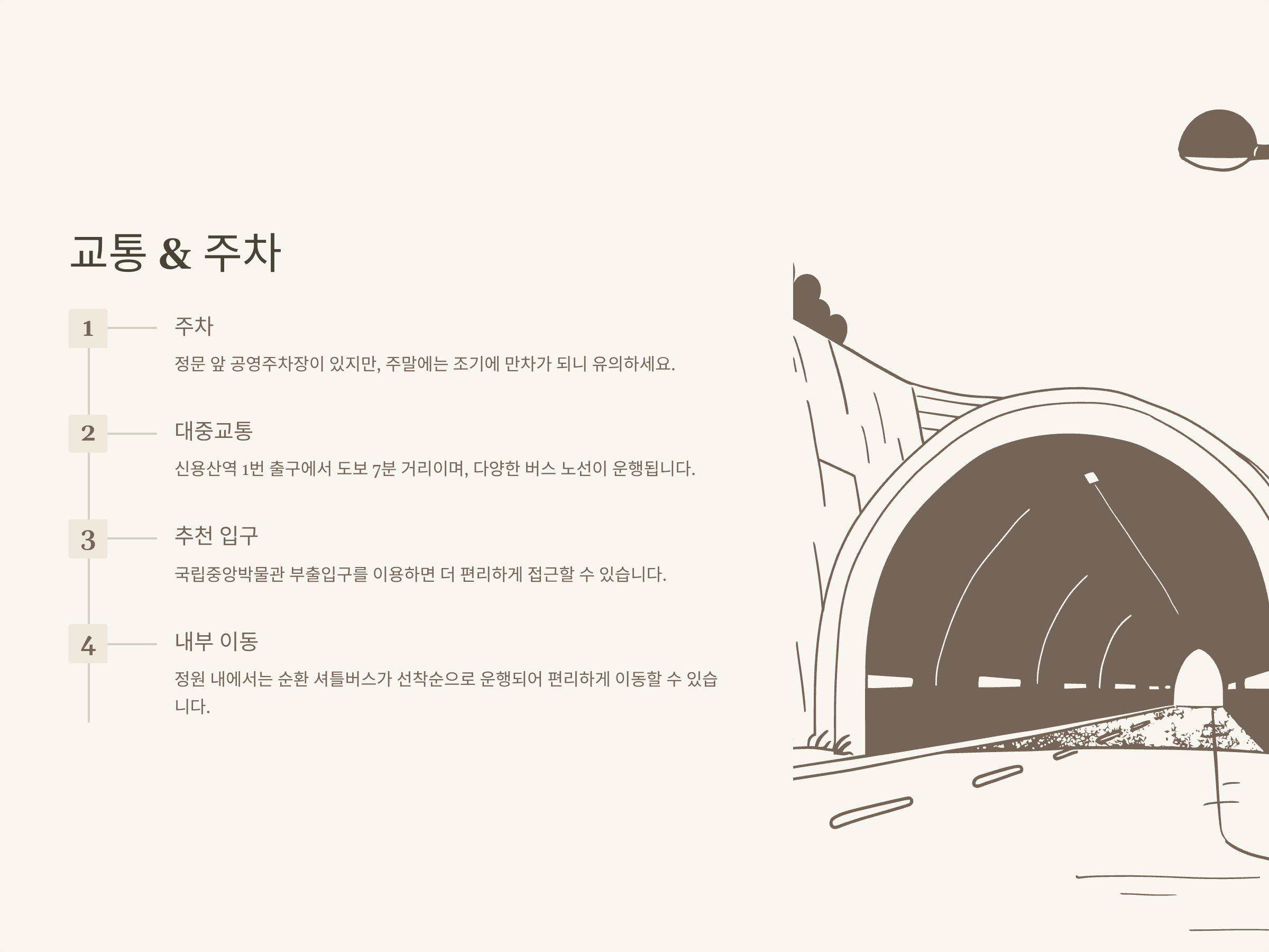 용산 어린이정원은 접근성이 정말 좋은 편입니다. 제가 주말 오전에 방문했을 때도 주차장 여유가 있었고, 대중교통으로도 쉽게 접근할 수 있어 부담이 적었어요. 공식 주차장은 어린이정원 입구 앞에 위치해 있고, 주말에는 조기 만차될 수 있으니 가능하다면 지하철 신용산역 1번 출구(도보 7분)나 국립중앙박물관 방향 부출입구를 이용하면 훨씬 편했습니다. 정원 내부 순환 셔틀버스도 운영되고 있는데, 선착순 탑승 방식이라 이용객이 많은 시간대엔 탑승 대기가 있었습니다. 저는 아쉽게 만차로 이용은 못했지만, 아이들이 타고 순환하는 걸 보니 정말 편리해 보였어요.