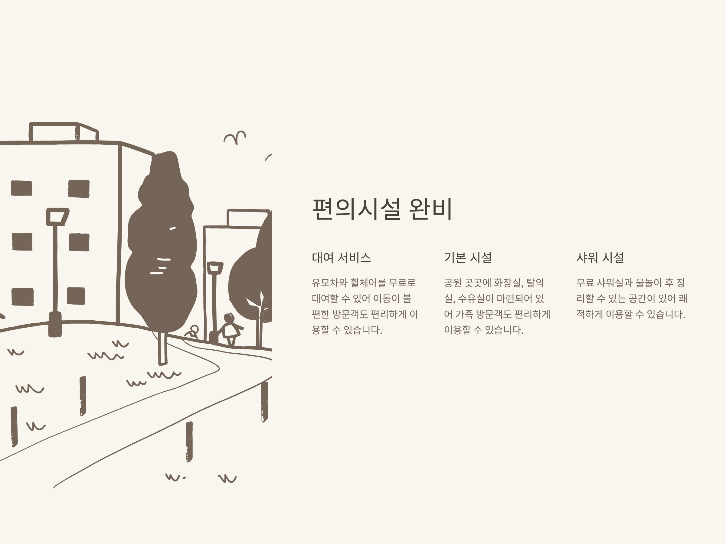 편의: 화장실, 탈의실, 유모차·휠체어 대여, 수유실