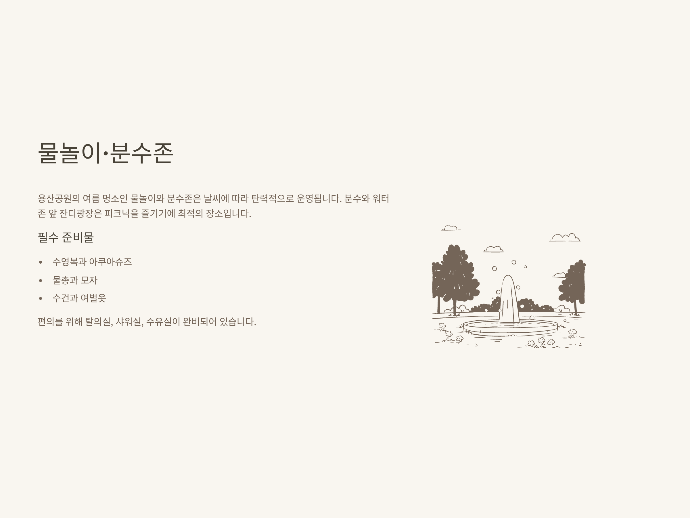 용산 어린이정원은 서울 한복판에서 분수와 물놀이가 가능한 아주 특별한 공간이에요. 실제로 여름에 방문하면 잔디광장 앞 분수에서 아이들이 신나게 뛰어노는 모습을 쉽게 볼 수 있었습니다. 분수대 물놀이존은 주말에 특히 인기라 돗자리 깔고 앉아서 아이들을 지켜보며, 저도 피크닉 기분을 만끽했습니다. 물놀이나 분수는 날씨에 따라 탄력적으로 운영되기 때문에, 방문 전 공식 안내에서 시간과 위치를 꼭 체크하는 게 좋았습니다. 여름철 한정 물놀이 프로그램이나 워터가든 이벤트가 있을 때는 물총, 여벌 옷, 수건 등을 꼭 챙기세요. 저도 아이들과 방문할 때는 항상 물놀이 준비물(수영복, 아쿠아슈즈, 모자 등)을 미리 챙겨가야 스트레스가 없었습니다.