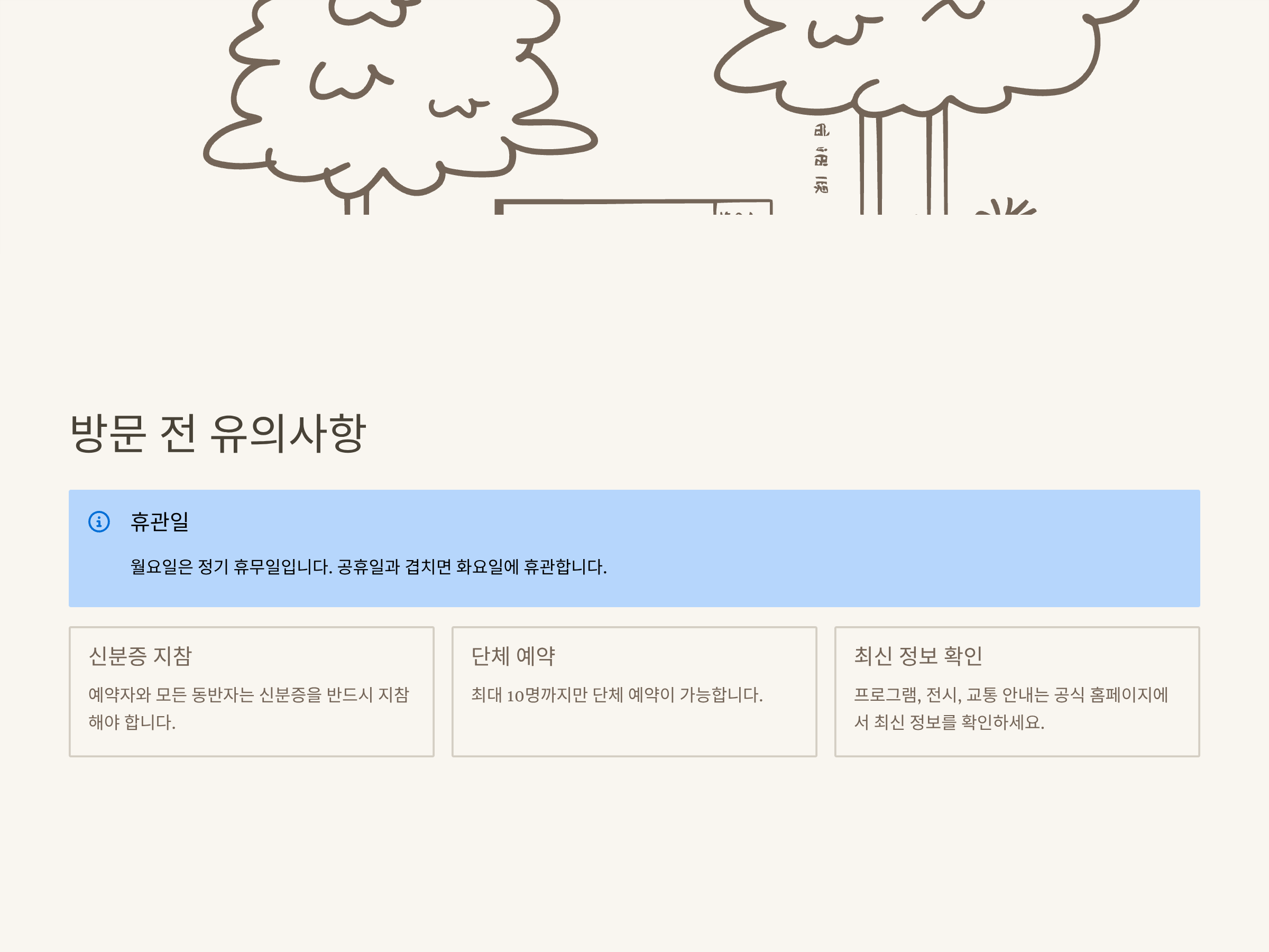용산 어린이정원은 임시 개방 공간이기 때문에 입장 시 신분증 확인이 필수입니다. 저는 예약자 정보와 신분증이 다를 경우 입장이 불가하다는 안내를 현장에서 여러 번 들었습니다. 어린이·가족·단체 모두 동일하게 신분증이나 학생증을 꼭 챙기셔야 해요. 현장에 도착하면 안내센터에서 예약확인 및 신분증 확인을 하고 입장권을 받게 됩니다. 그리고 매주 월요일은 휴무이니 방문 계획에 꼭 참고하세요. 만약 방문일이 공휴일과 겹치는 경우, 화요일이 휴관이 되니 일정 조율이 필요합니다.