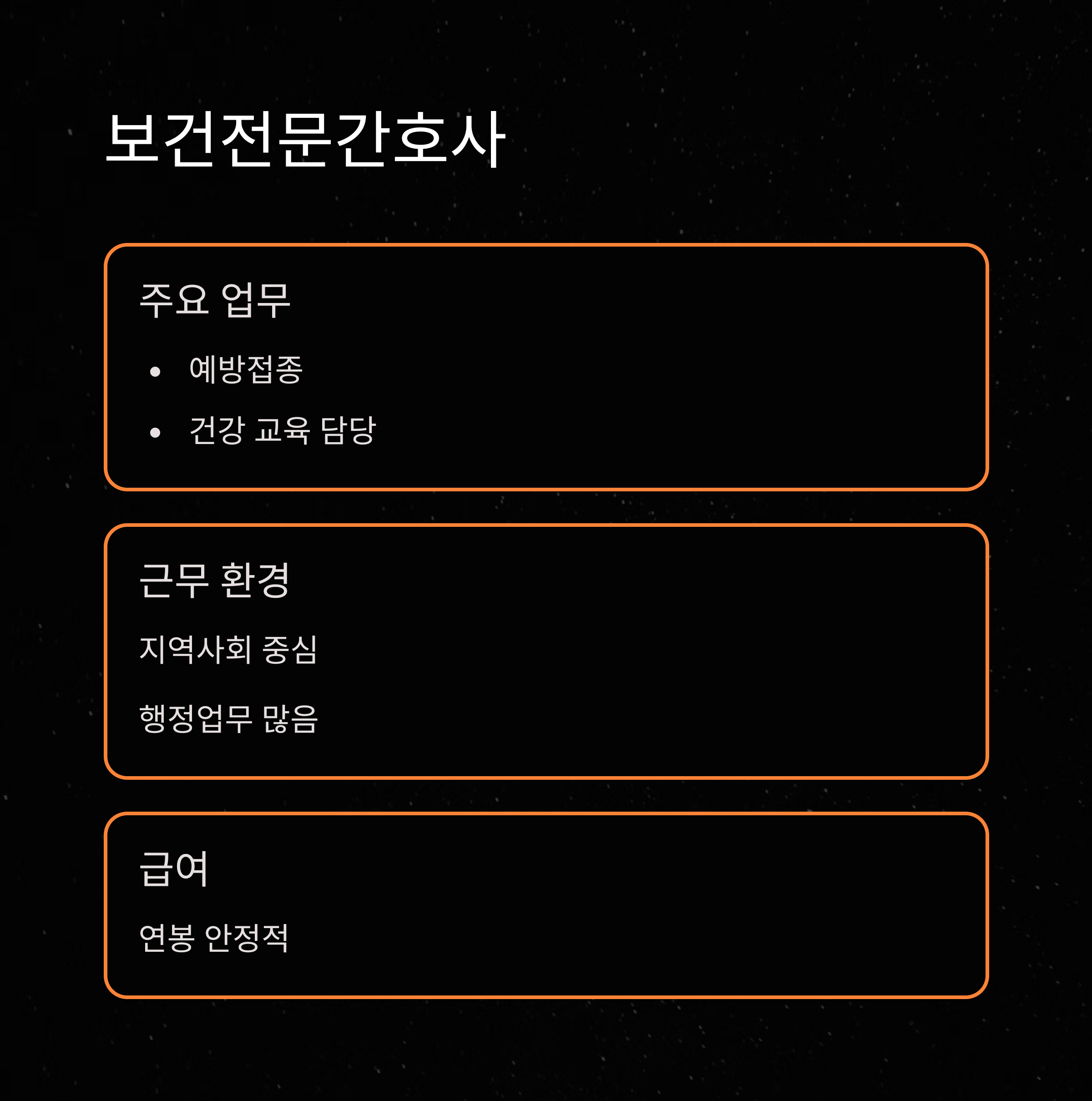| 보건전문간호사 | 예방접종, 보건교육 | 지역사회 중심 |