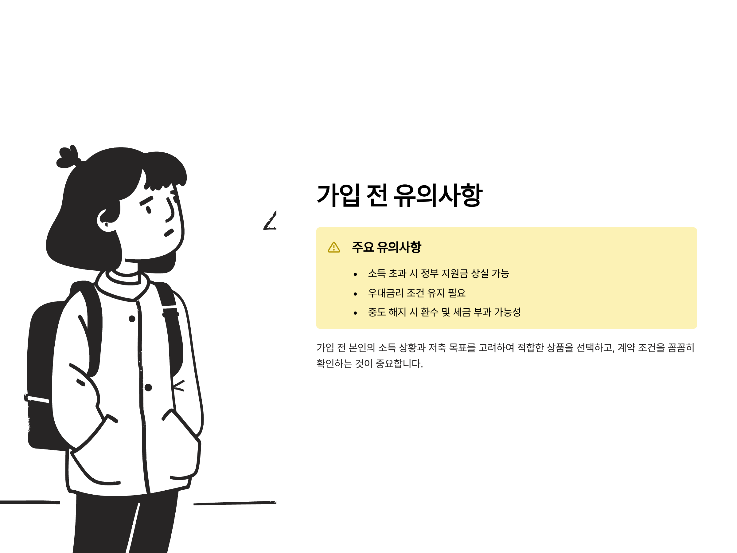 청년 적금은 혜택이 크지만, 가입 전 반드시 확인해야 할 사항들이 있습니다. 저는 예전에 조건을 꼼꼼히 읽지 않고 가입했다가, 중도 해지 시 지원금이 전액 환수되는 규정을 뒤늦게 알게 되어 손해를 본 경험이 있습니다. 먼저, 소득 기준을 초과하면 정부 지원금 자격이 상실될 수 있습니다. 또한 일부 상품은 우대금리 조건을 매달 충족해야 하므로, 급여이체·카드 사용 실적 등을 꾸준히 유지해야 합니다. 중도 해지 시에는 금리와 지원금 혜택이 줄어들고, 경우에 따라 세금이 부과될 수 있습니다. 계약서와 상품설명서를 반드시 확인하고, 본인의 저축 가능 금액과 생활비 계획을 먼저 세운 뒤 가입하는 것이 안전합니다.