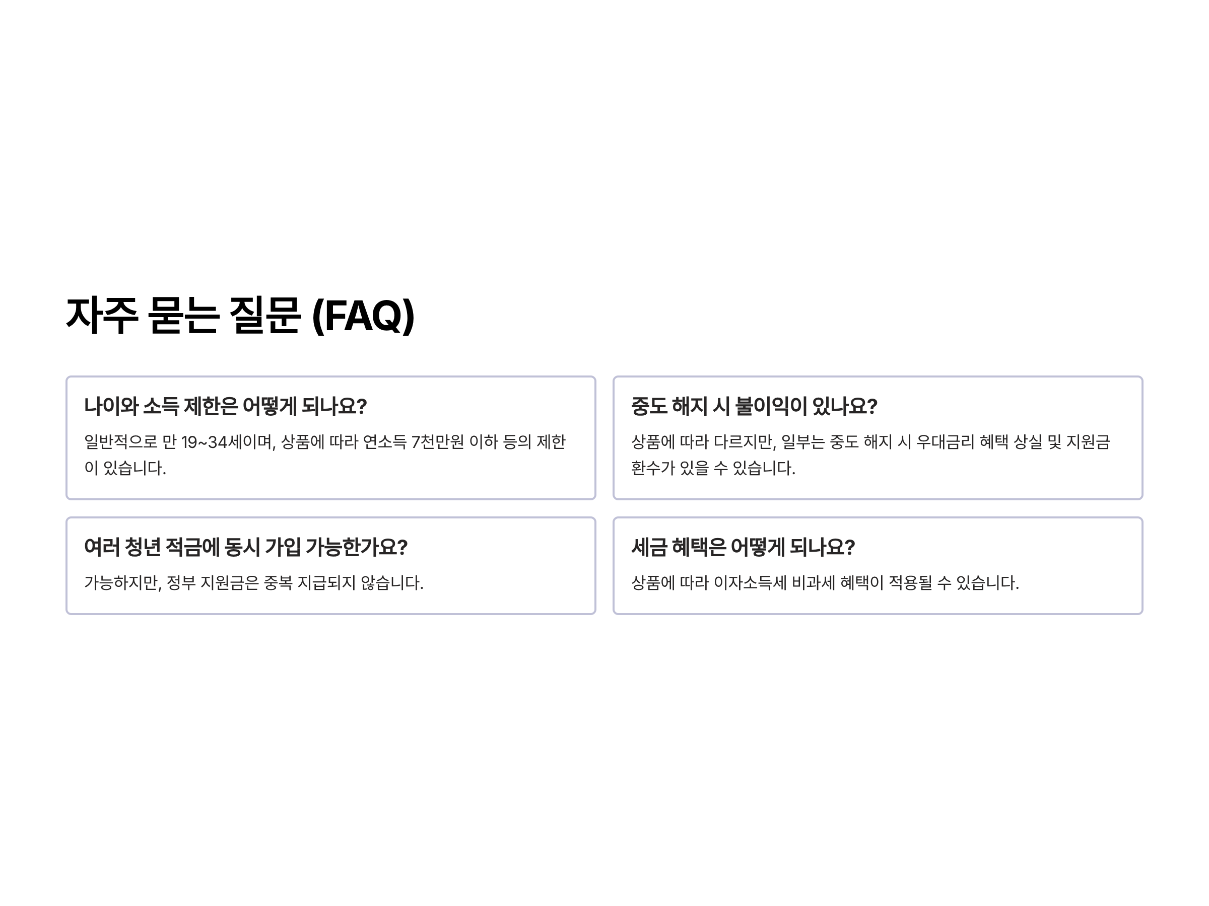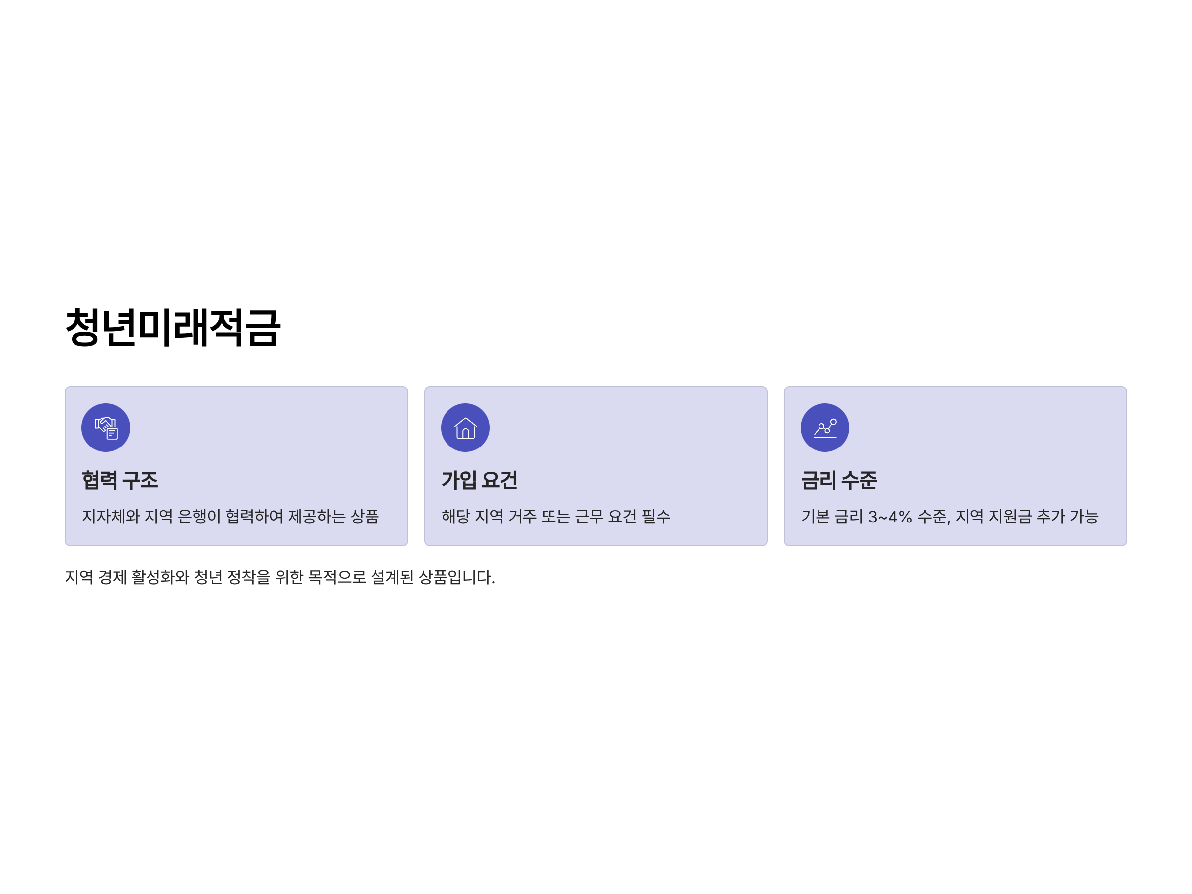 | 청년미래적금 | 지역별 상이 | 연 4%+지자체 지원 | 지방 청년 지원 중심 |