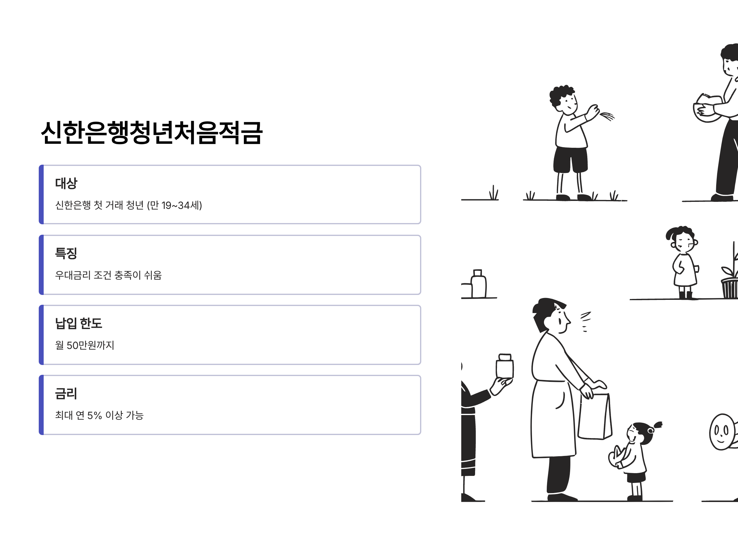 | 신한은행청년처음적금 | 만 19~34세, 소득 제한 | 연 5%+우대금리 | 첫 금융거래 청년 대상 |