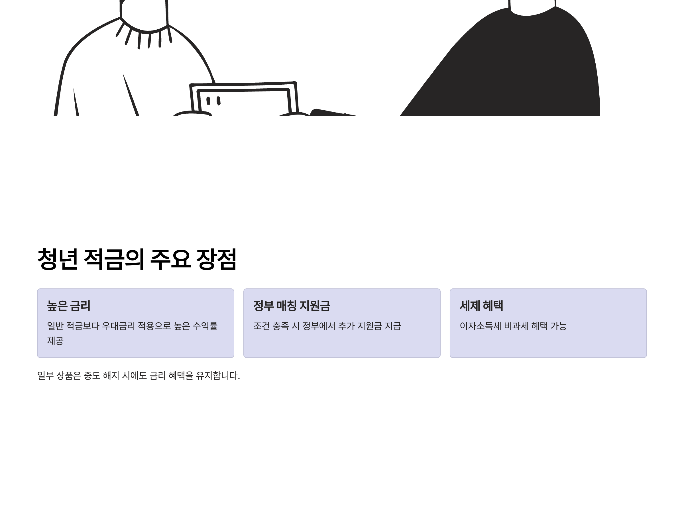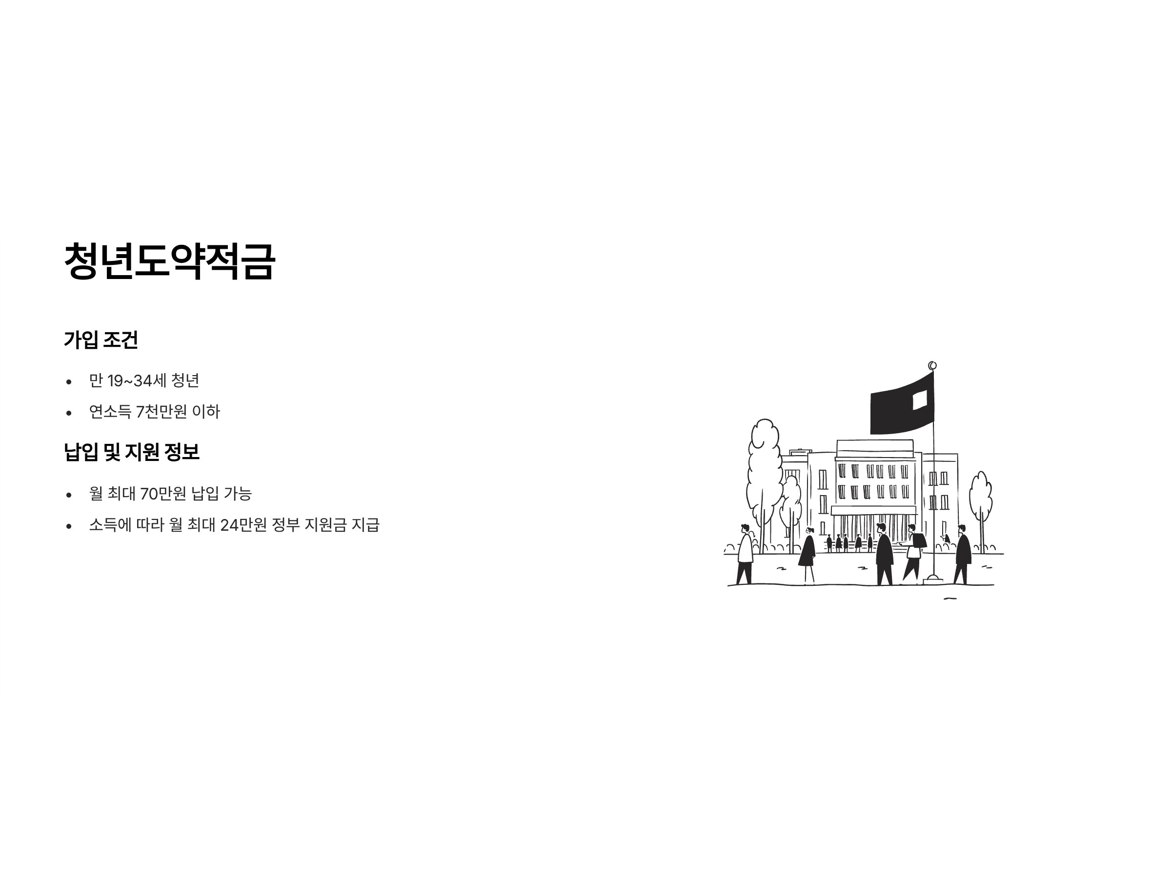 | 청년도약적금 | 만 19~34세, 연소득 7천만원 이하 | 연 6%+정부 지원금 | 5년 만기 목돈 마련 |