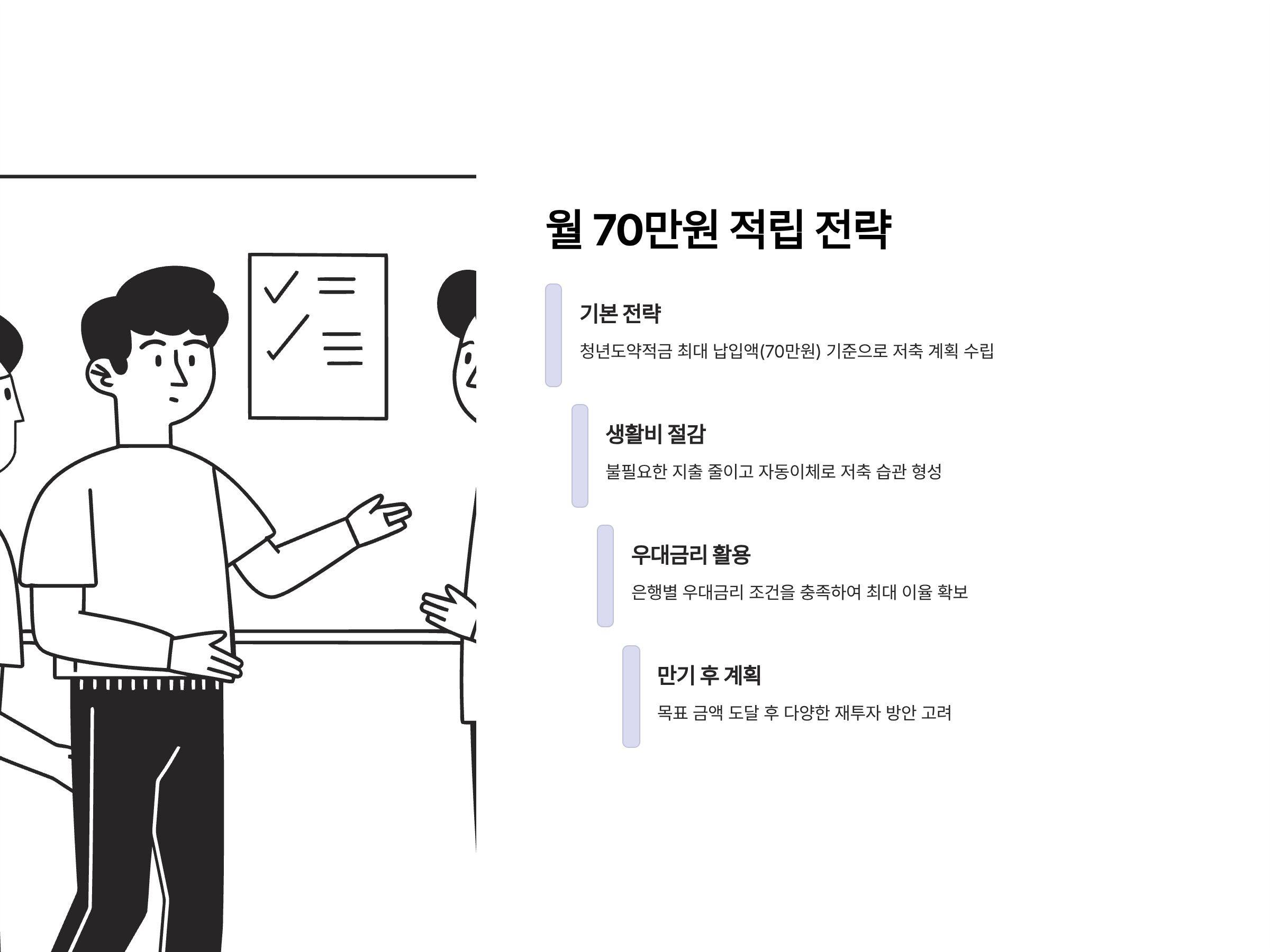 월 납입 70만원은 청년도약적금의 최대 납입 한도입니다. 저는 월 70만원씩 5년을 유지했더니 원금과 이자, 정부 지원금 합산 금액이 상당했는데, 이를 통해 전세 자금 일부를 마련할 수 있었습니다. 하지만 70만원을 꾸준히 납입하려면 생활비 계획을 철저히 세워야 합니다. 식비·교통비 절감, 불필요한 구독 서비스 해지 등으로 여유 자금을 확보하는 것이 중요합니다. 또한 일부 은행은 자동이체 시 우대금리를 주므로 이를 적극 활용하세요.