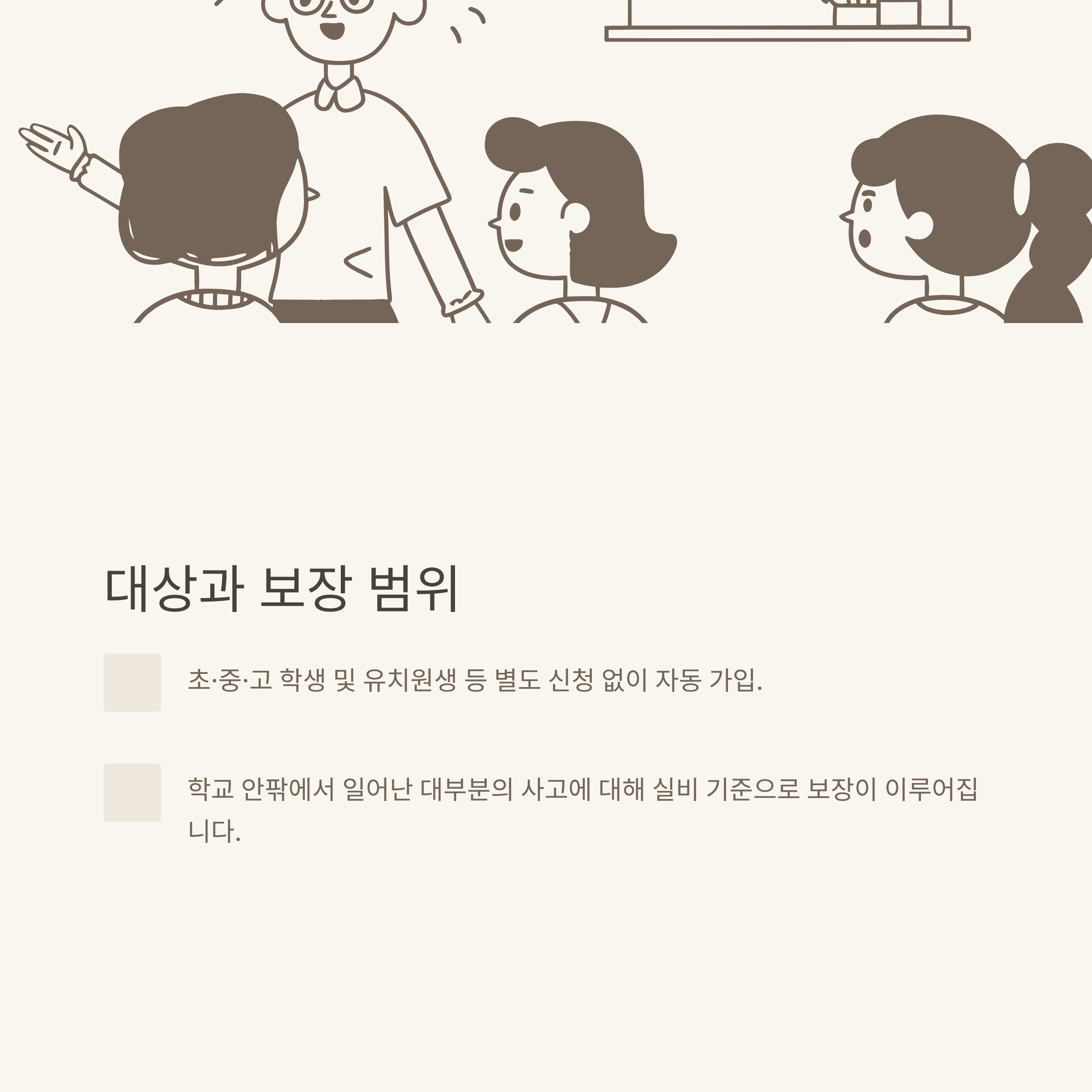 | 보장 범위 | 학교생활 중 사고(수업, 통학, 행사 등) |