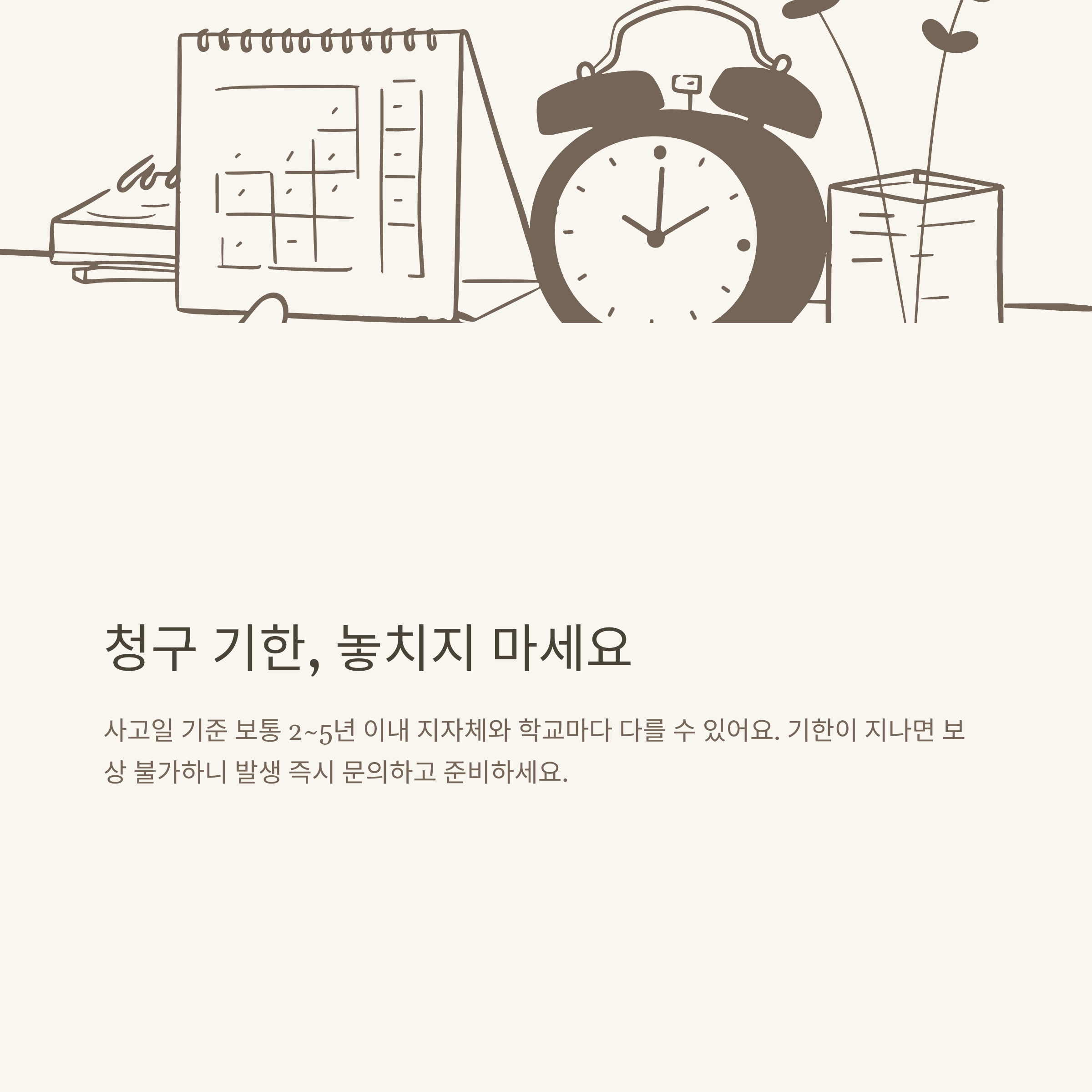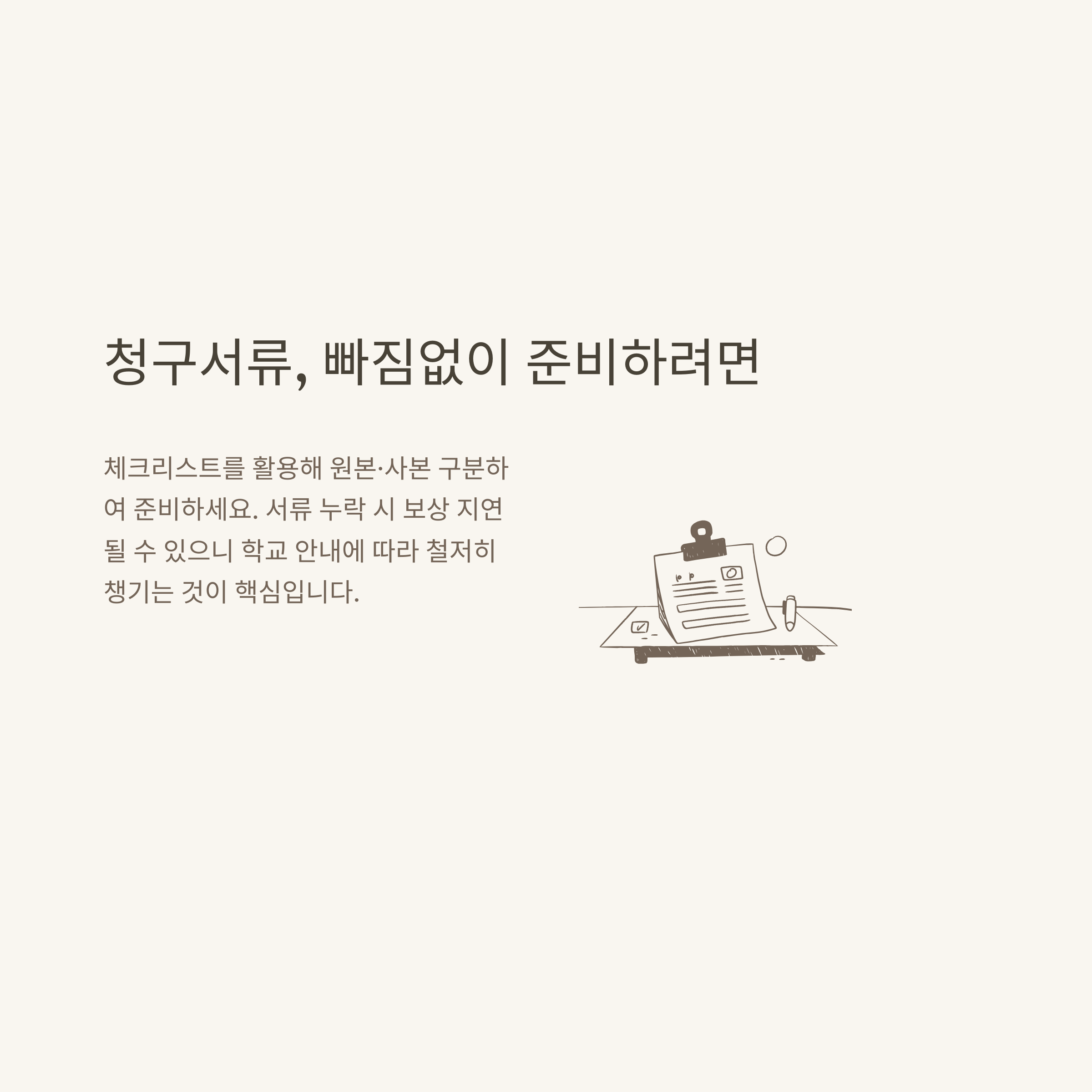 실제로 저는 학교 행정실과 소통하며 빠짐없이 제출해, 보상금도 빠르게 수령할 수 있었습니다.