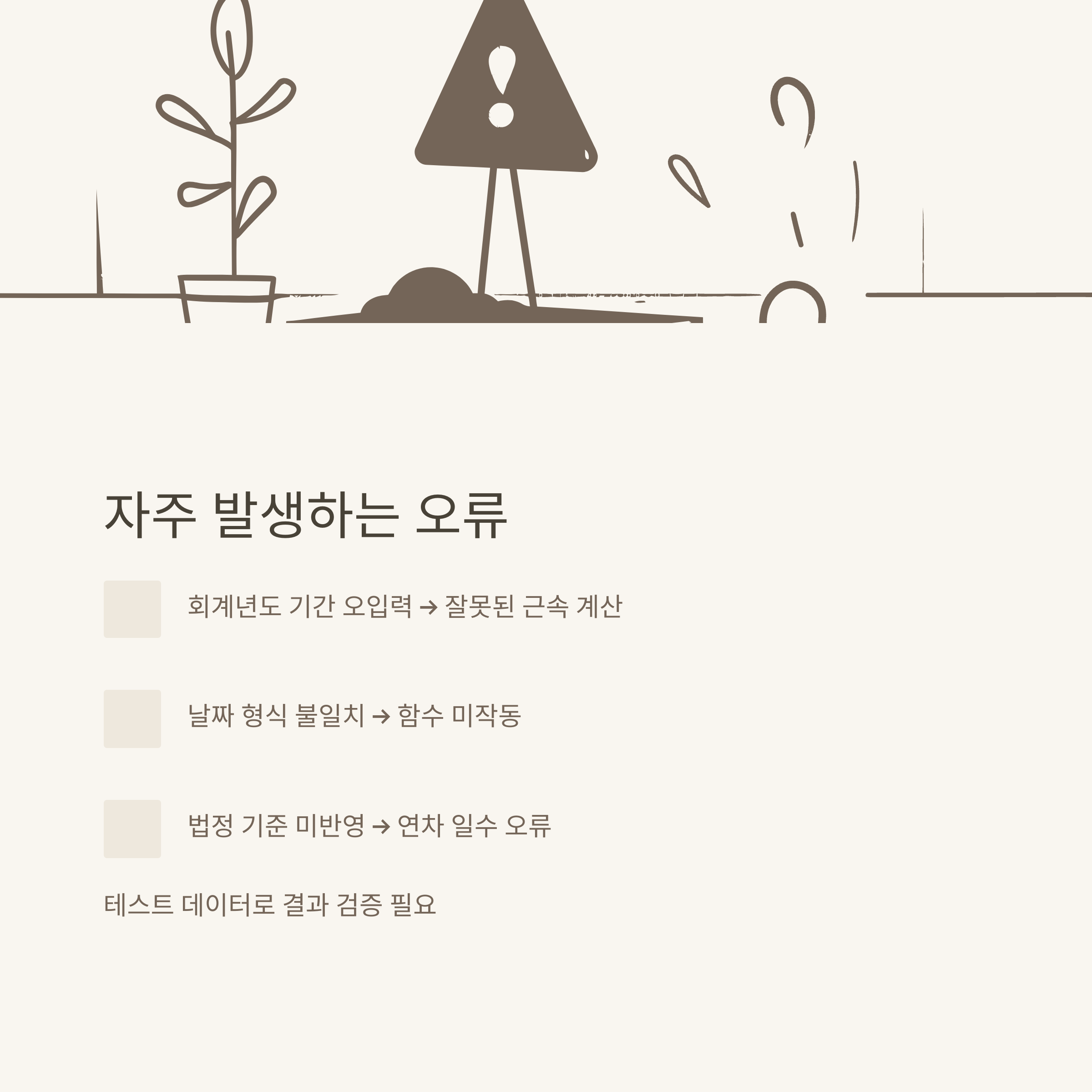 제가 경험한 회계년도 연차 계산 오류는 주로 날짜 입력 실수, 회계년도 기간 오인, 법적 기준 미반영에서 발생했습니다. 특히 회계년도 시작일과 종료일이 잘못 설정되면 계산 결과가 크게 달라져 혼란을 초래했습니다. 또한, 엑셀 함수 오류나 날짜 형식 불일치도 자주 문제를 일으켜 입력값 확인과 함수 검증이 매우 중요하다는 것을 알게 되었습니다.