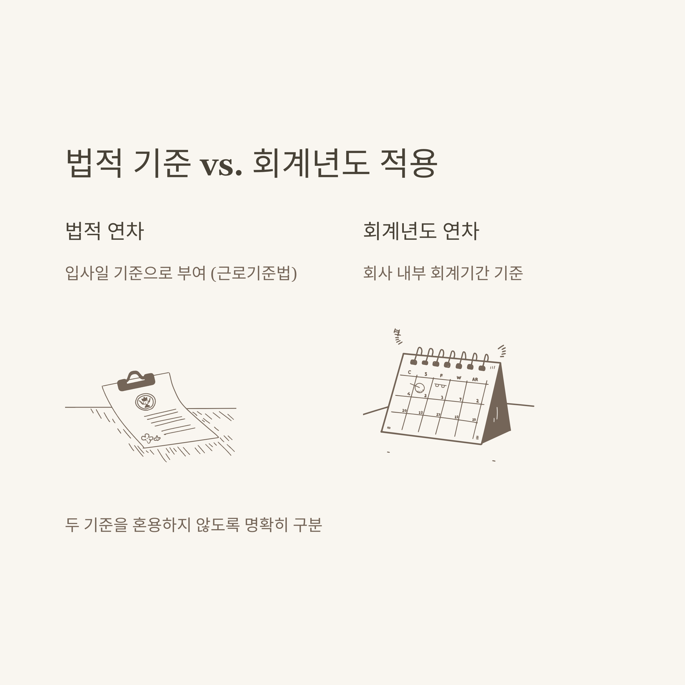 저는 법적 연차 부여 기준과 회계년도 기준을 혼동한 적이 있었는데, 두 가지는 엄연히 다릅니다. 법적 연차는 근로기준법에 따라 입사일을 기준으로 산정하지만, 회계년도 기준은 회사 내부 회계 기간에 따라 산정합니다. 따라서 회사가 회계년도 기준으로 연차를 관리한다면 입사일과 무관하게 회계년도 내 근속 일수를 기준으로 연차가 부여될 수 있습니다. 이러한 차이를 이해하고 있어야 연차 계산 오류를 방지할 수 있습니다.