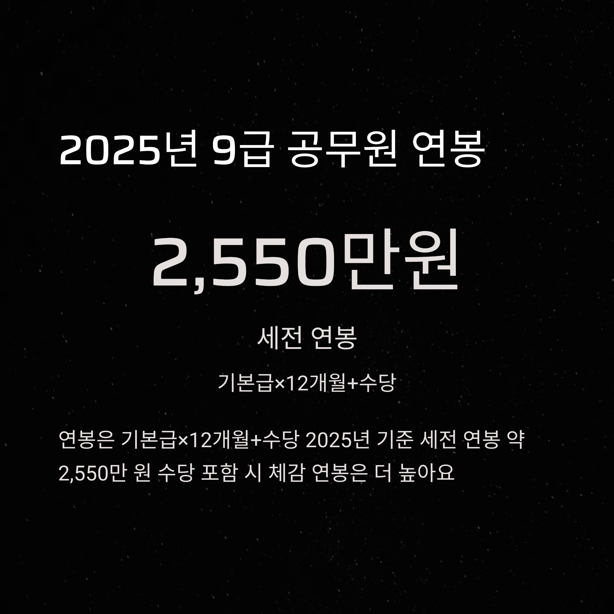 제가 실제 계산해본 9급 초임 기준 연봉은 약 2,550만 원 수준(세전)이었습니다. 복리후생비나 선택적 복지포인트까지 합치면 체감 연봉은 2,600만 원 이상입니다.