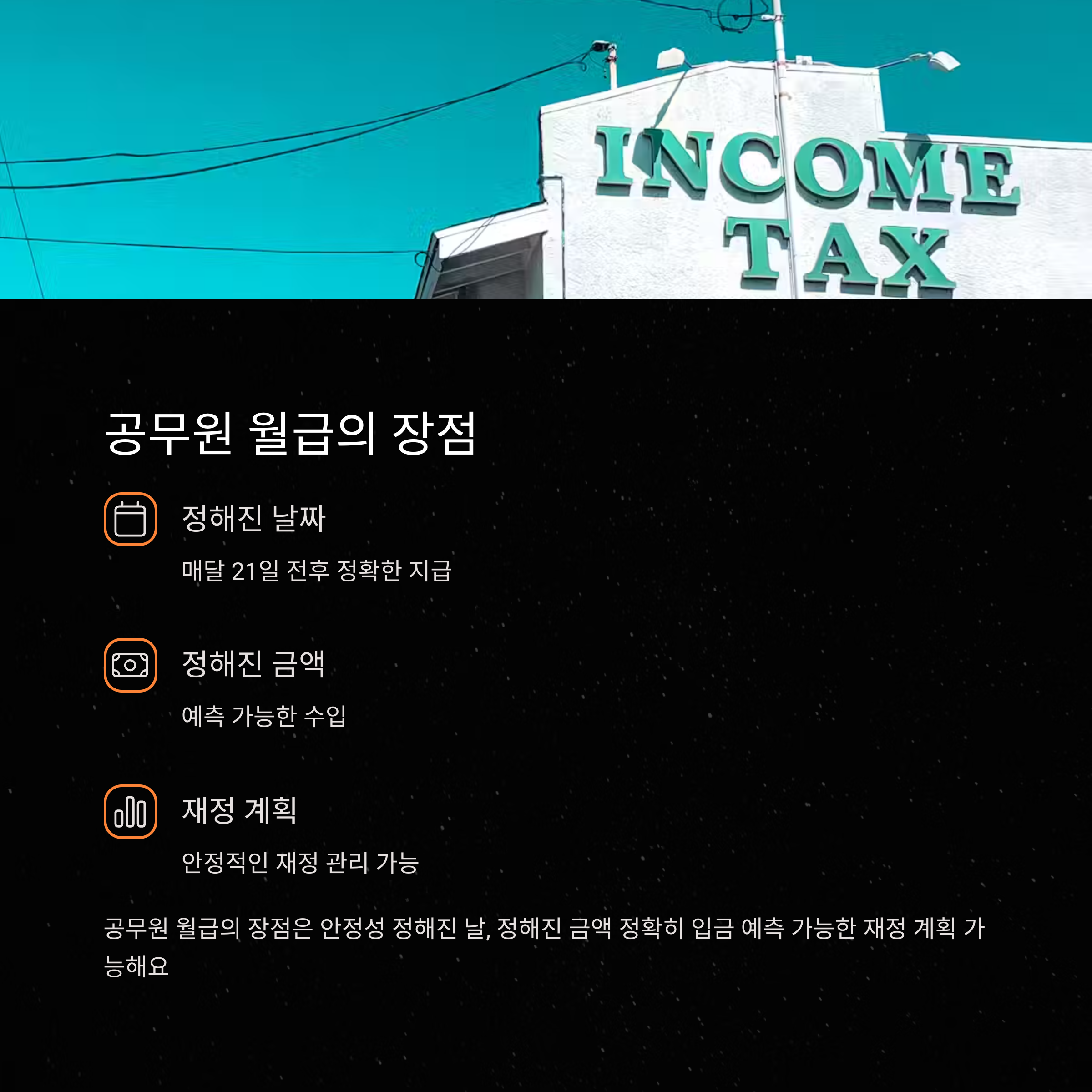 보너스나 급여 변동 없이 정해진 날짜에 정확한 금액이 입금되기 때문에 금융관리 측면에서 매우 유리하죠. 그리고 호봉이 오르면 월급도 무조건 올라가니, 장기적으로 봤을 땐 민간보다 나은 점도 분명 있습니다.