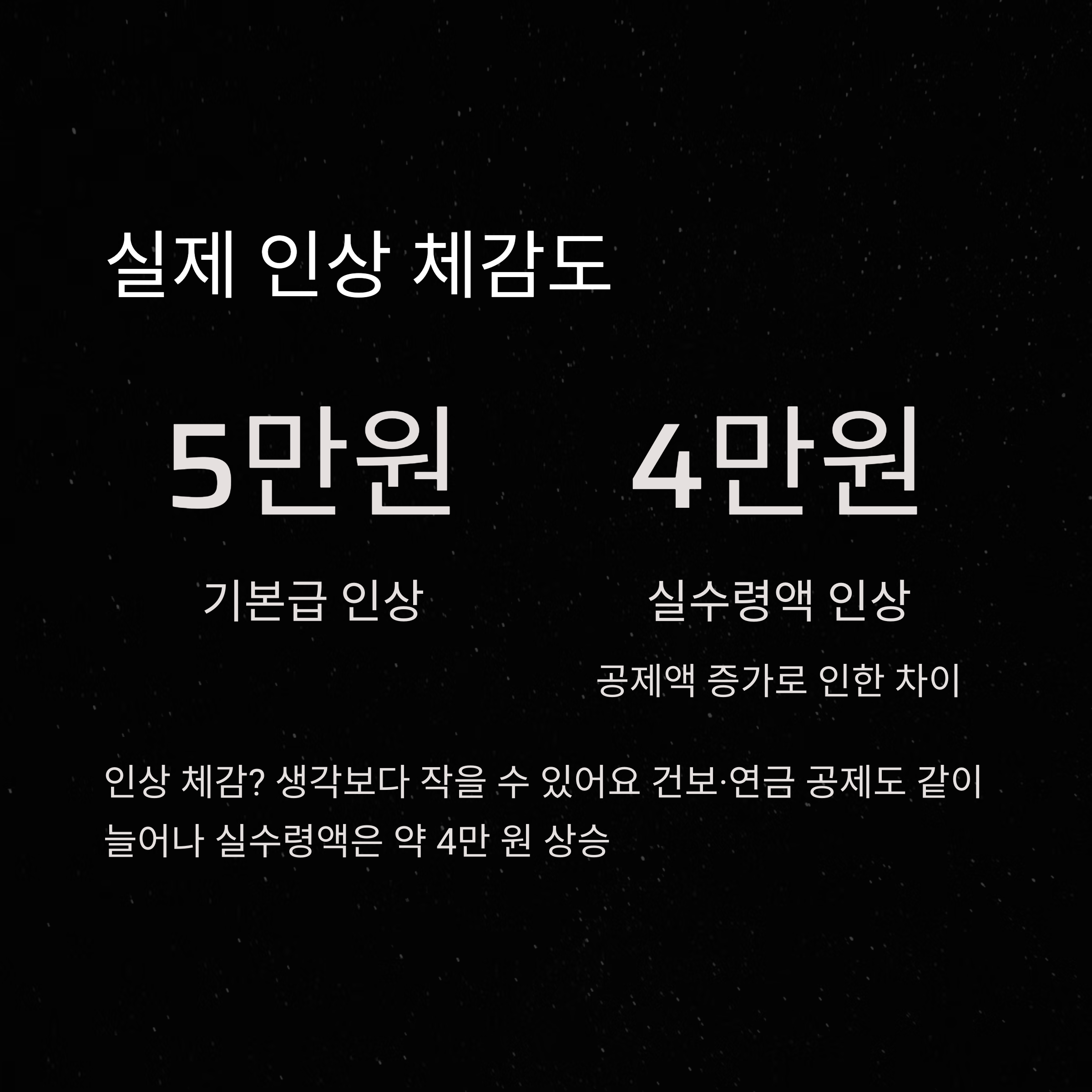 기본급은 51,000원 올랐지만, 건강보험과 국민연금 공제도 함께 증가했기 때문에 실수령액 차이는 미미했습니다. 그래서인지 '인상됐다'는 느낌보단 '조금 늘었네?' 수준이었어요.