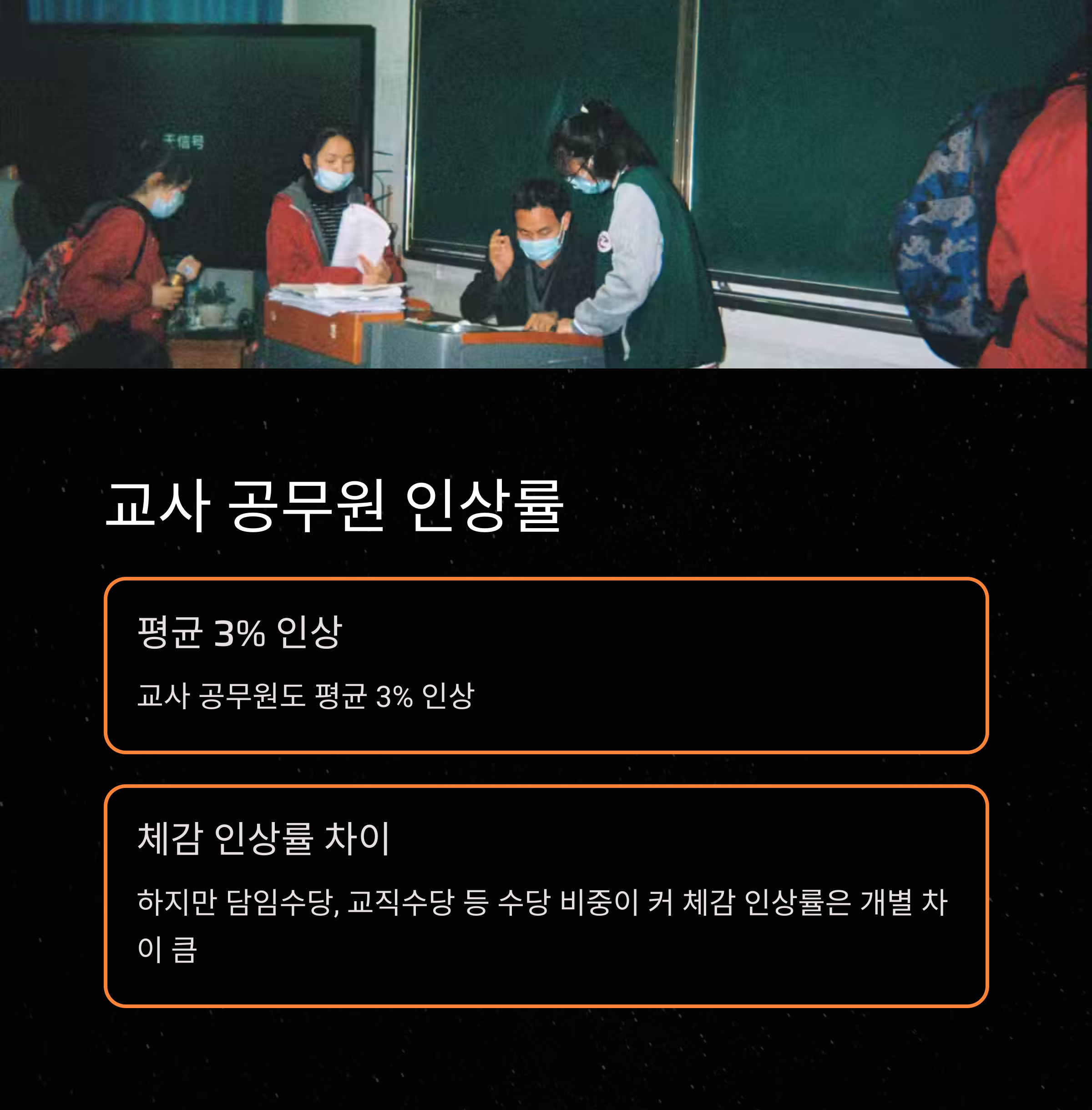 2025년 교사 직렬의 공무원도 일반 공무원과 동일하게 평균 3.0% 인상 적용을 받았습니다. 하지만 실제로는 근무 연차, 호봉, 직무성과급 등에 따라 수령액 차이가 상당합니다. 제가 교직에 있는 지인에게 확인해본 결과, 초임 교사 기준으로 월급이 220만 원대 → 227만 원대로 인상됐다고 합니다.